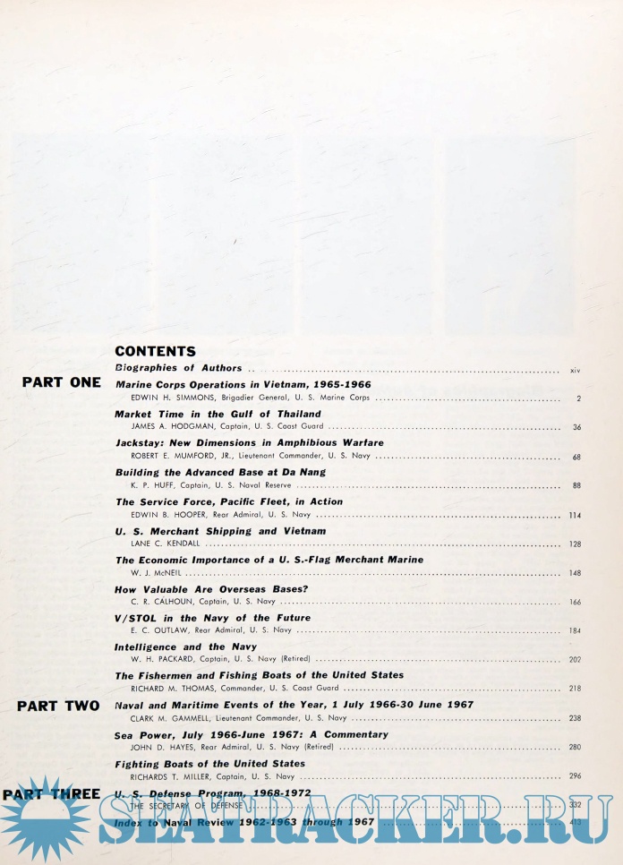 Description: Publication by United States Naval Institute of Navy and Marine Operations and Duties in 1966-67. Included Marine Corps Operations in Vietnam; Coastal Duties in Thailand; New Dimensions in Amphibious Warfare; Building at Da Nang; Pacific Fleet in Action; U.S. Merchant Shipping in Vietnam; Intelligence and the Navy; Naval and Maritime Events of the Year, 66-67; Fighting Boats of the U.S.