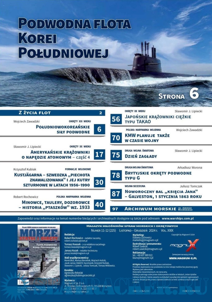 Description: Польский морской журнал. Издается с 1996 года, первоначально как ежеквартальный. С 1999 года издается раз в два месяца, а с 2007 года-как ежемесячный. Первоначально назывался Morza Statki i Okrety, в 2006 году переименован в Morze Statki i Okrety. С 2004 года полностью цветной (ранее только вставки). В 2008 году стали издаваться специальные выпуски, первоначально нерегулярные. С 2014 года выпускается как обычное издание и специальное издание, с непрерывной нумерацией.