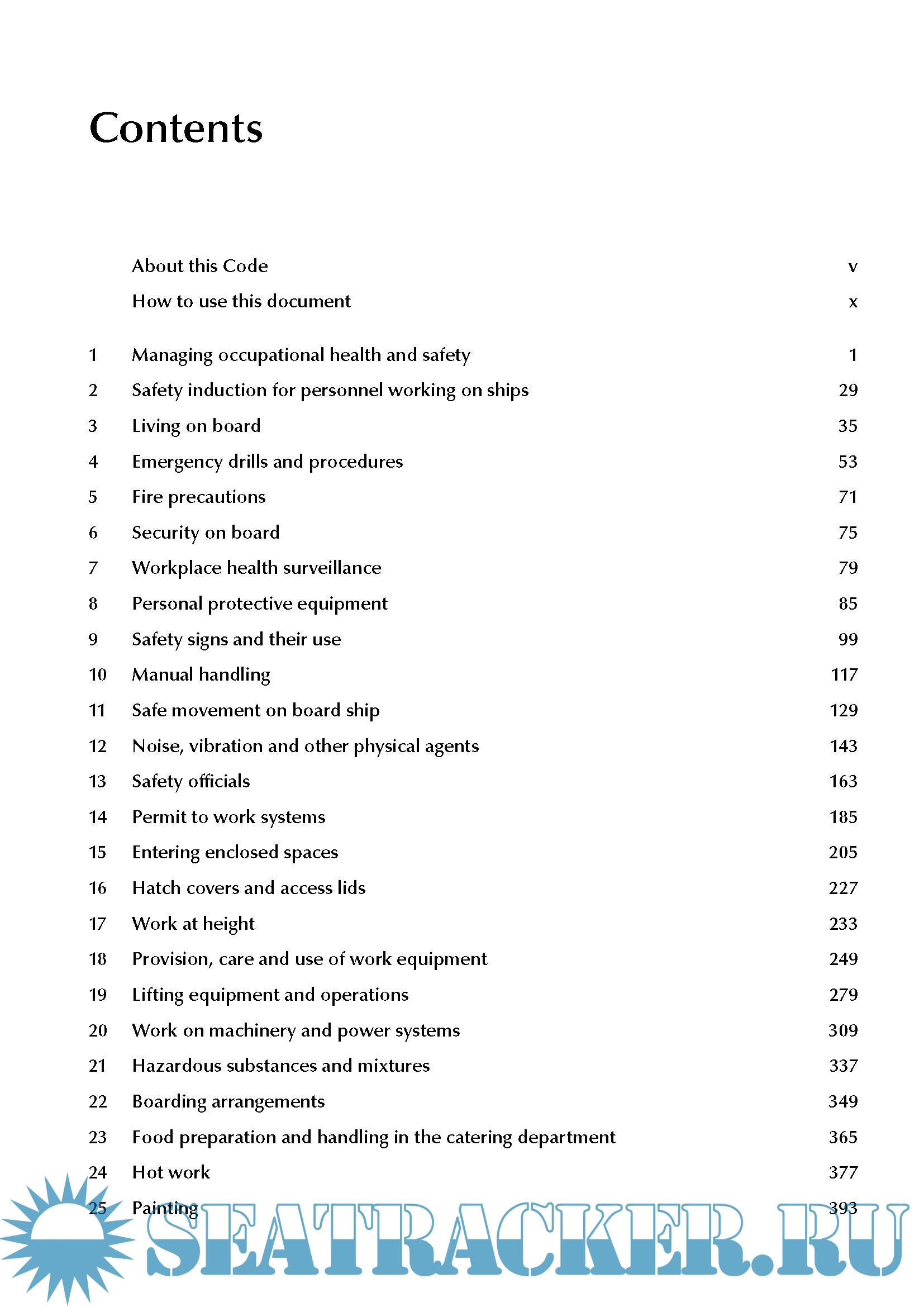 The Code covers the regulatory framework and provides best practice guidance for health and safety on board ship. It also gives guidance on safety management, identifies statutory duties underlying the advice and includes practical information for safe working on board.