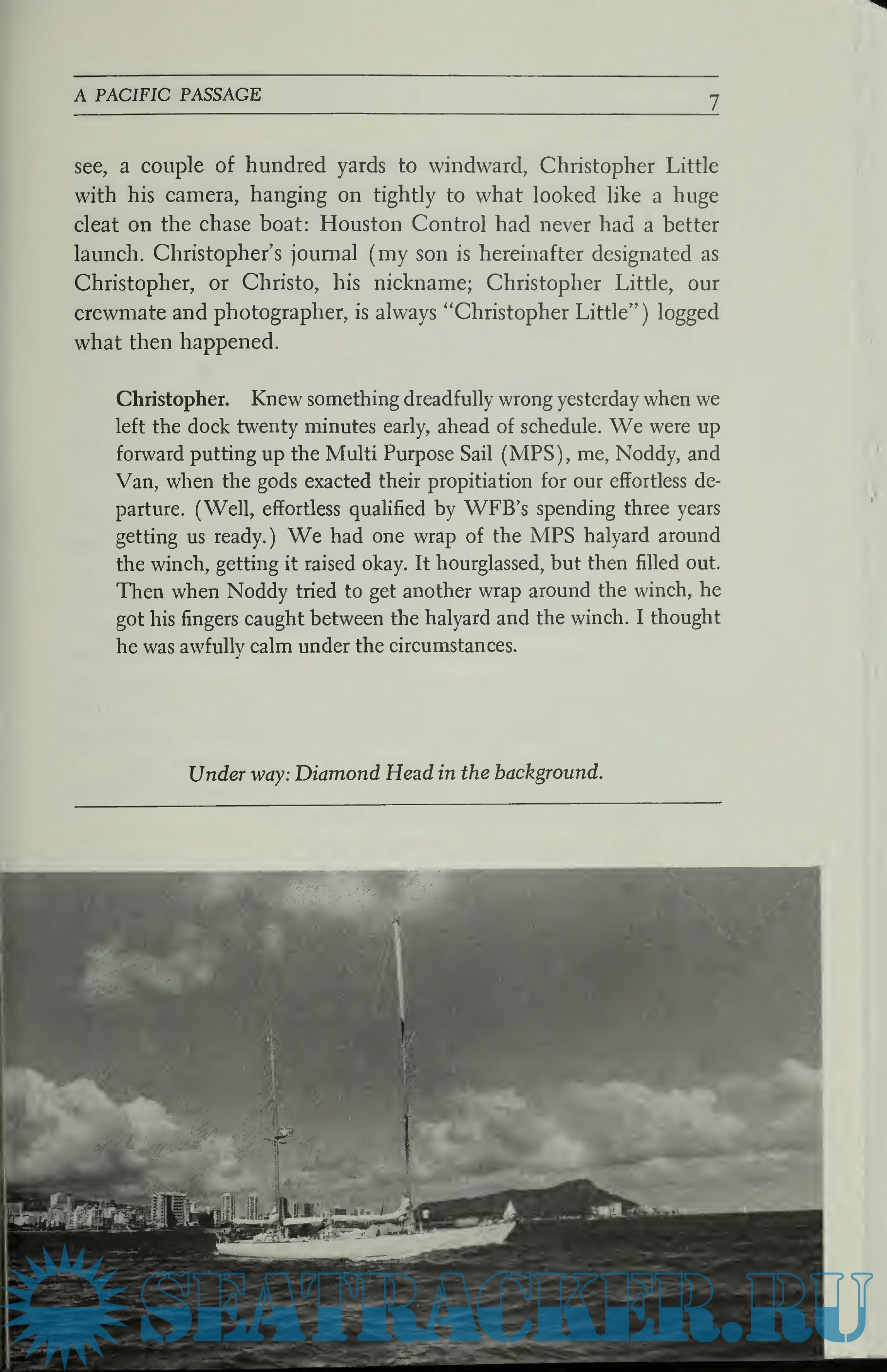 Description: Chronicles the author's four thousand-mile sailing voyage across the Pacific with four close friends, his son Christopher, and a photographer