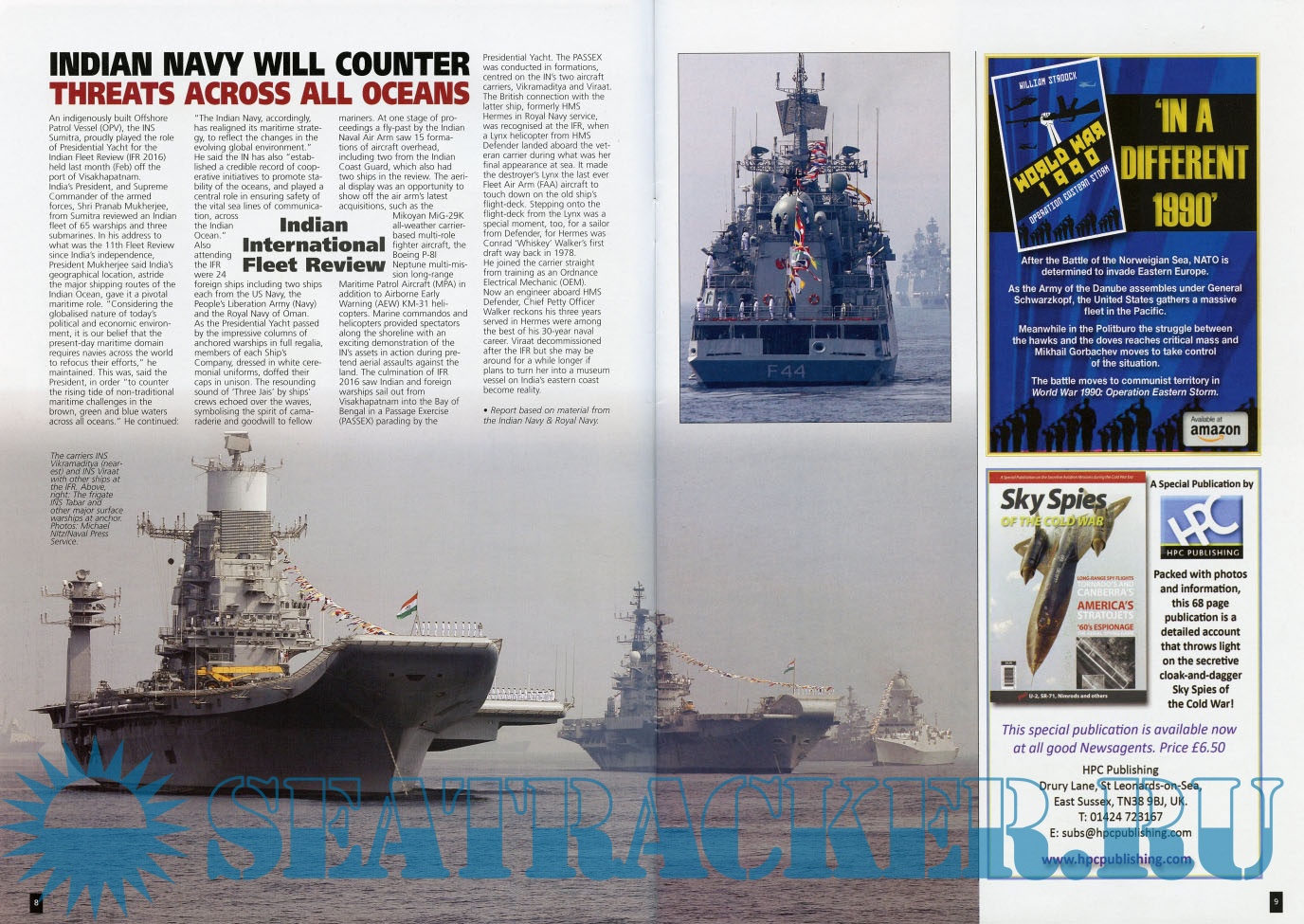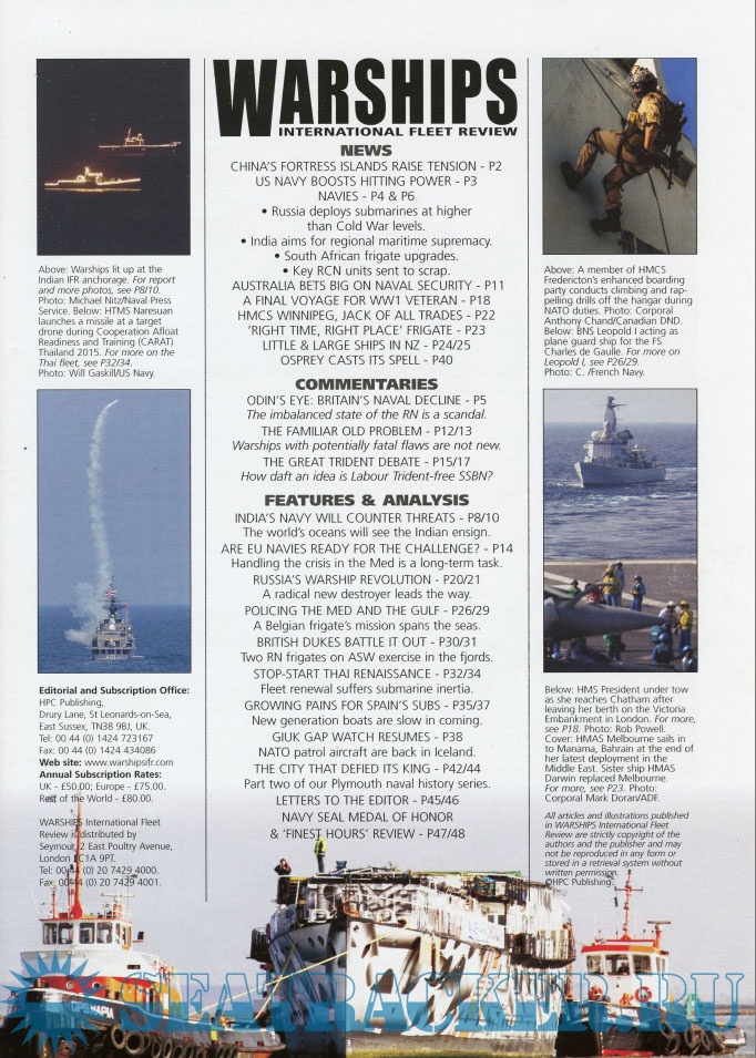 Description: Warships IFR puts the spotlight on the latest developments in the world’s navies. It covers current defence issues and has comments by leading analysts. The magazine regularly includes features on the Royal Navy and the US Navy in addition to incorporating news and features on all other navies across the globe. Warships IFR frequently carries in-depth articles on naval heritage.WARSHIPS International Fleet Review is published 12 times a year by Tandy Media Ltd who also publish Shipping Today & Yesterday (which provides news and features from the world of merchant shipping).