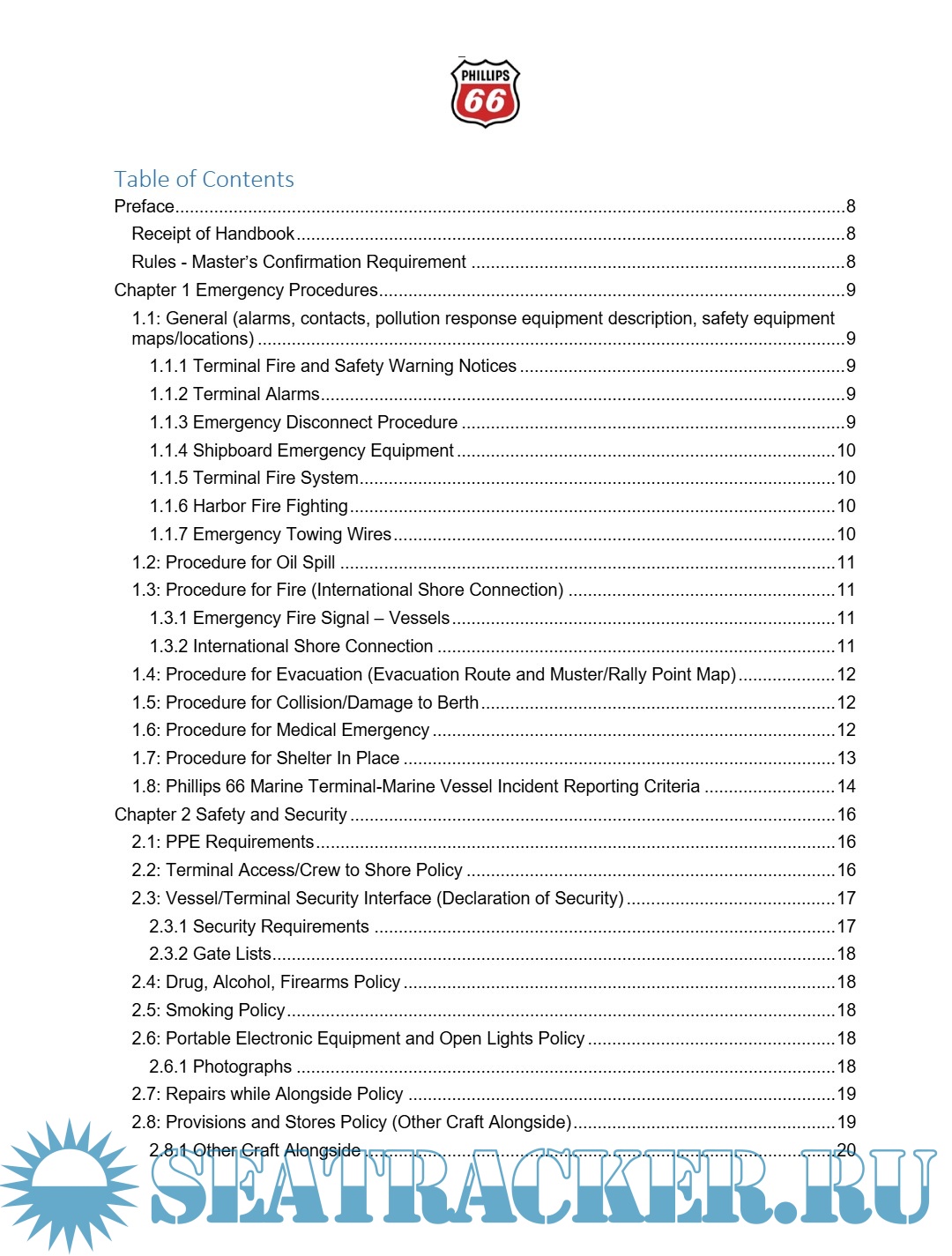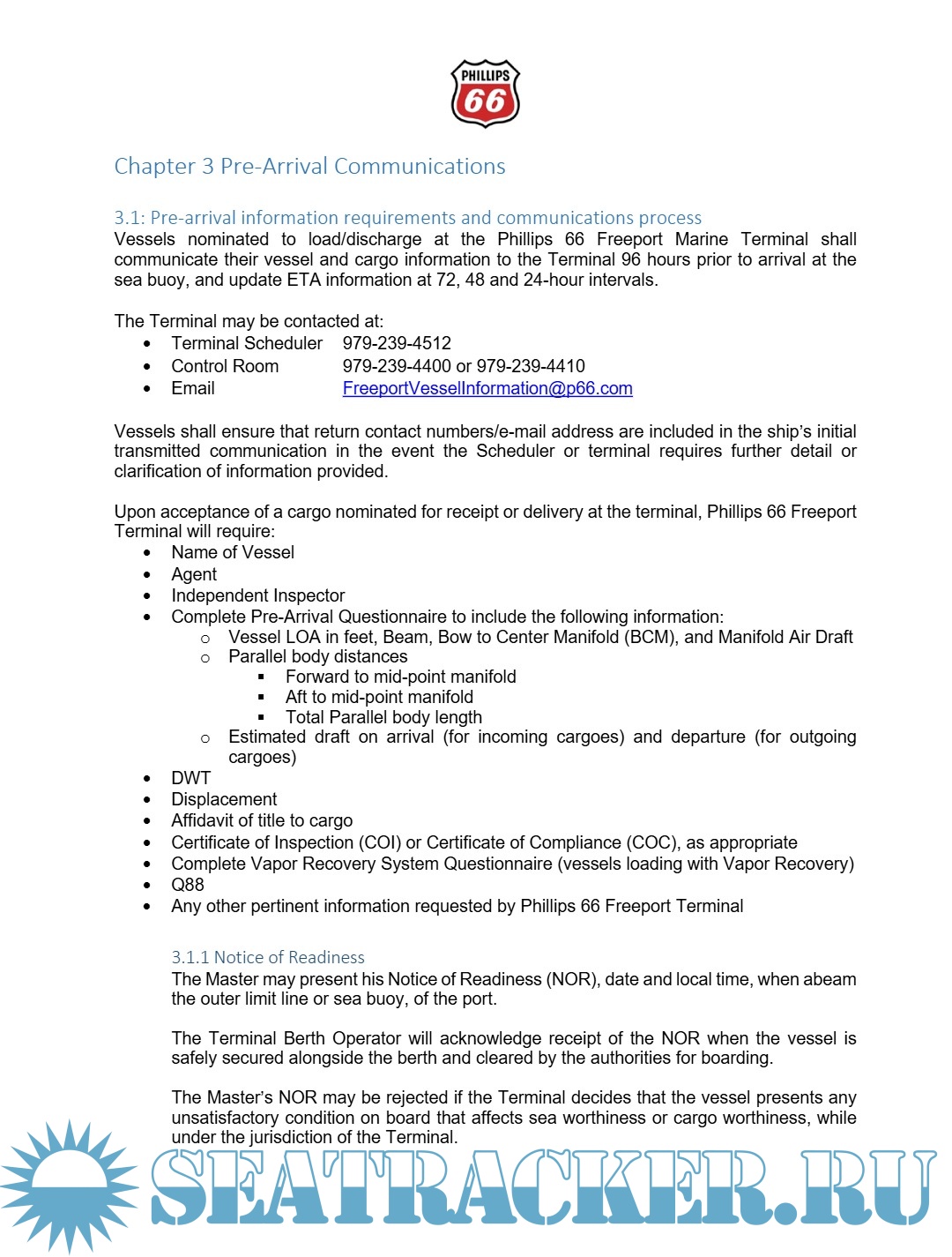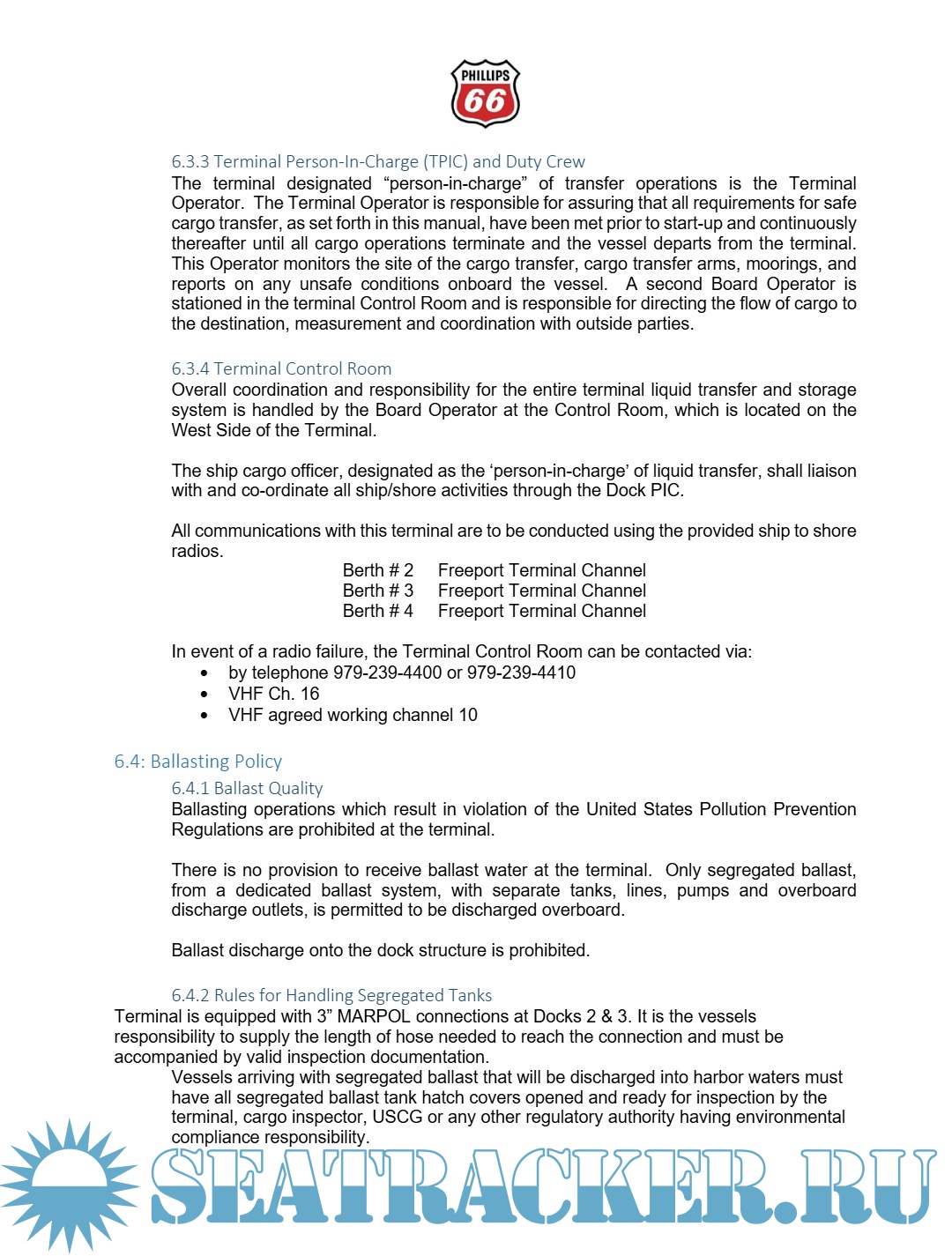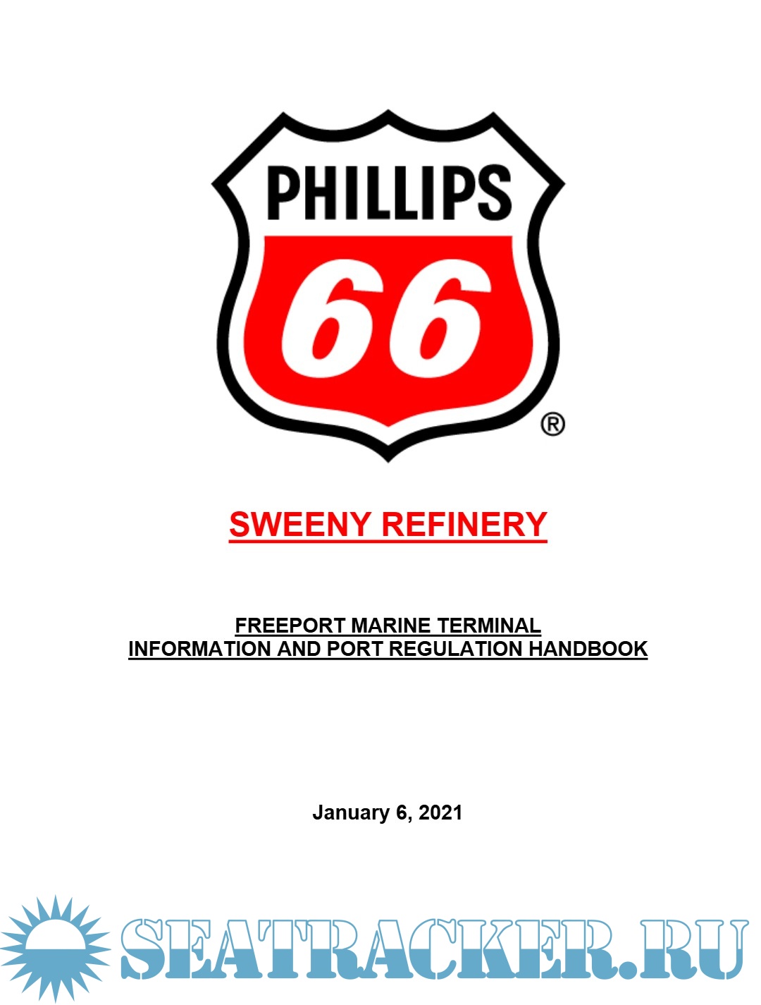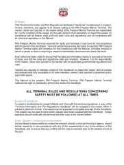 Description: This Terminal Information and Port Regulations Handbook is addressed to masters, owners, operators, and agents of all vessels calling at the P66 Freeport Marine Terminal. The master, owner and operator of the vessel calling at the Freeport Marine Terminal are responsible for: (a) the condition of the vessel, (b) the safe conduct of all operations on board the vessel, (c) compliance with all federal, state and local laws, rules and regulations, and (d) compliance with all rules and regulations in the Manual.