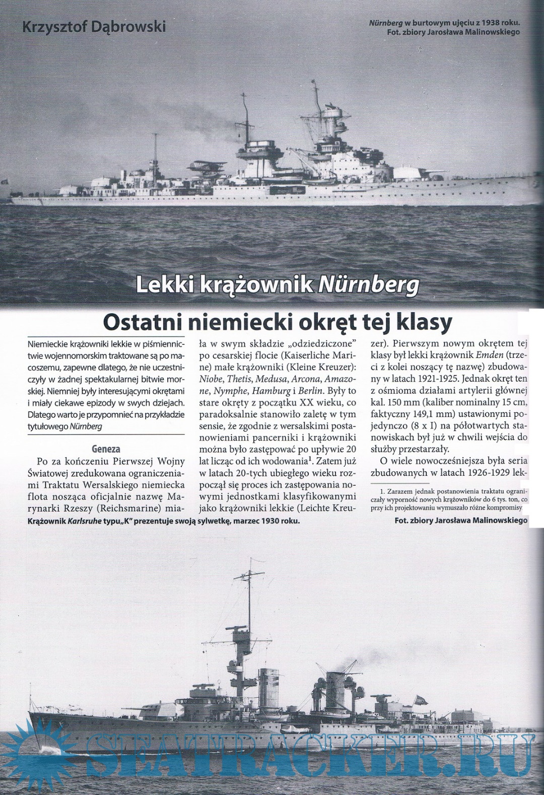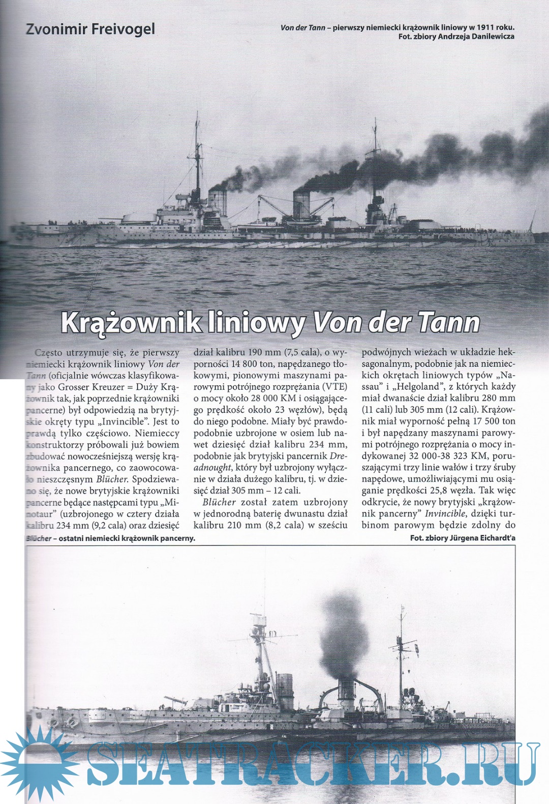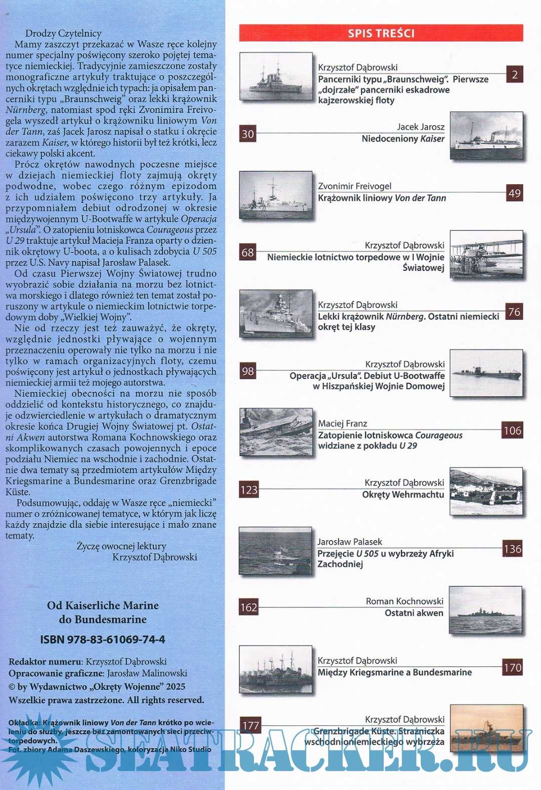 -Spis treści: Pancerniki typu Braunschweig Niedoceniony Kaiser Krążownik liniowy Von der Tann Niemieckie lotnictwo torpedowe w I Wojnie Światowej Lekki krążownik Nurnberg Operacja "Ursula" Debiut U-Bootwaffe w Hiszpańskiej Wojnie Domowej Zatopienie lotniskowca Courageous widziane z pokładu U 29 Okręty Wehrmachtu Przejęcie U 505 u wybrzeży Afryki Zachodniej Ostatni akwen Między Kriegsmarine a Bundesmarine Grenzbrigade Kuste