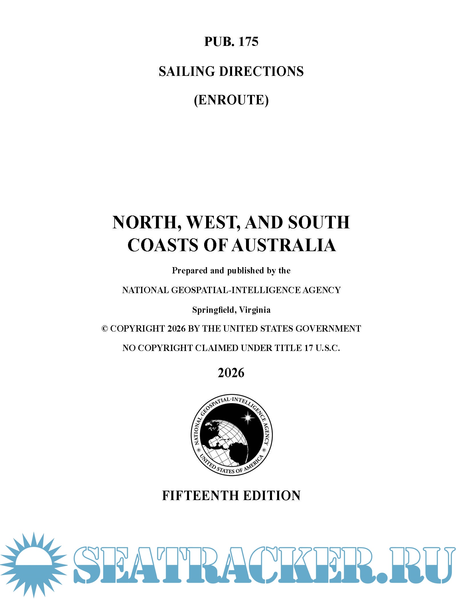 Description: Pub. 175, Sailing Directions (Enroute) North, West, and South Coasts of Australia, Fifteenth Edition, 2026, is issued for use in conjunction with Pub. 160, Sailing Directions (Planning Guide) South Atlantic Ocean and Indian Ocean.