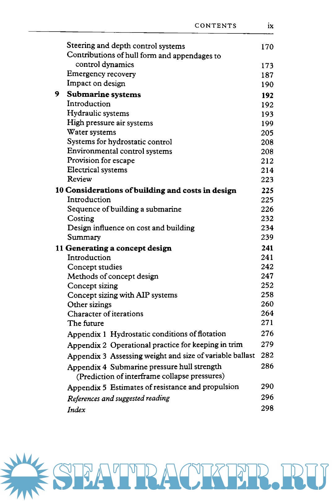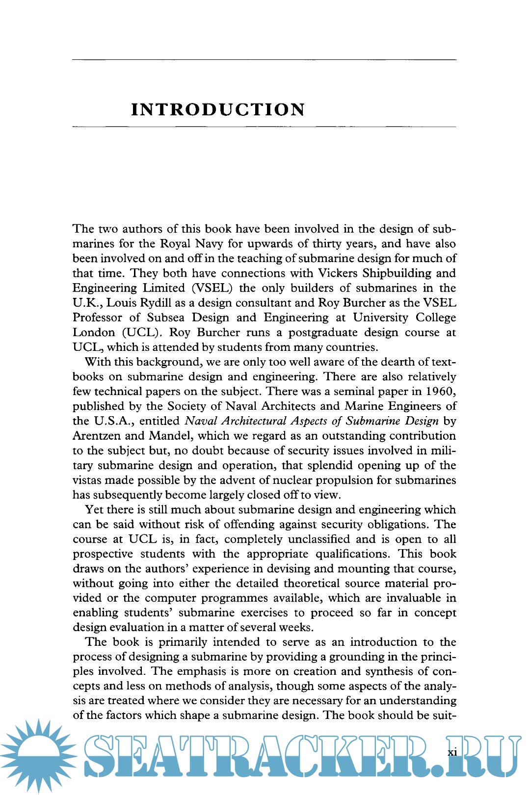 Year: 1995 Language: English Author: Burcher R., Rydill L.J Genre: Shipbuilding Publisher: Cambridge University Press Edition: 1st ISBN: 052155926X Format: PDF Quality: Scanned pages Pages count: 322 Description: This book shows how the engineering and architectural aspects of submarine design relate to each other, and describes the operational performance required of a vessel. The authors explain concepts of hydrodynamics, structure, powering and dynamics, in addition to architectural considerations that bear on the submarine design process. They pay particular attention to the interplay among these aspects of design, and devote a final chapter to the generation of the concept design for the submarine as a whole. Submarine design makes extensive use of computers, and the authors give examples of algorithms used in concept design. They provide engineering insight as well as an understanding of the intricacies of the submarine design process. The book will serve as a text for students and as a reference manual for practicing engineers and designers in marine and naval engineering.