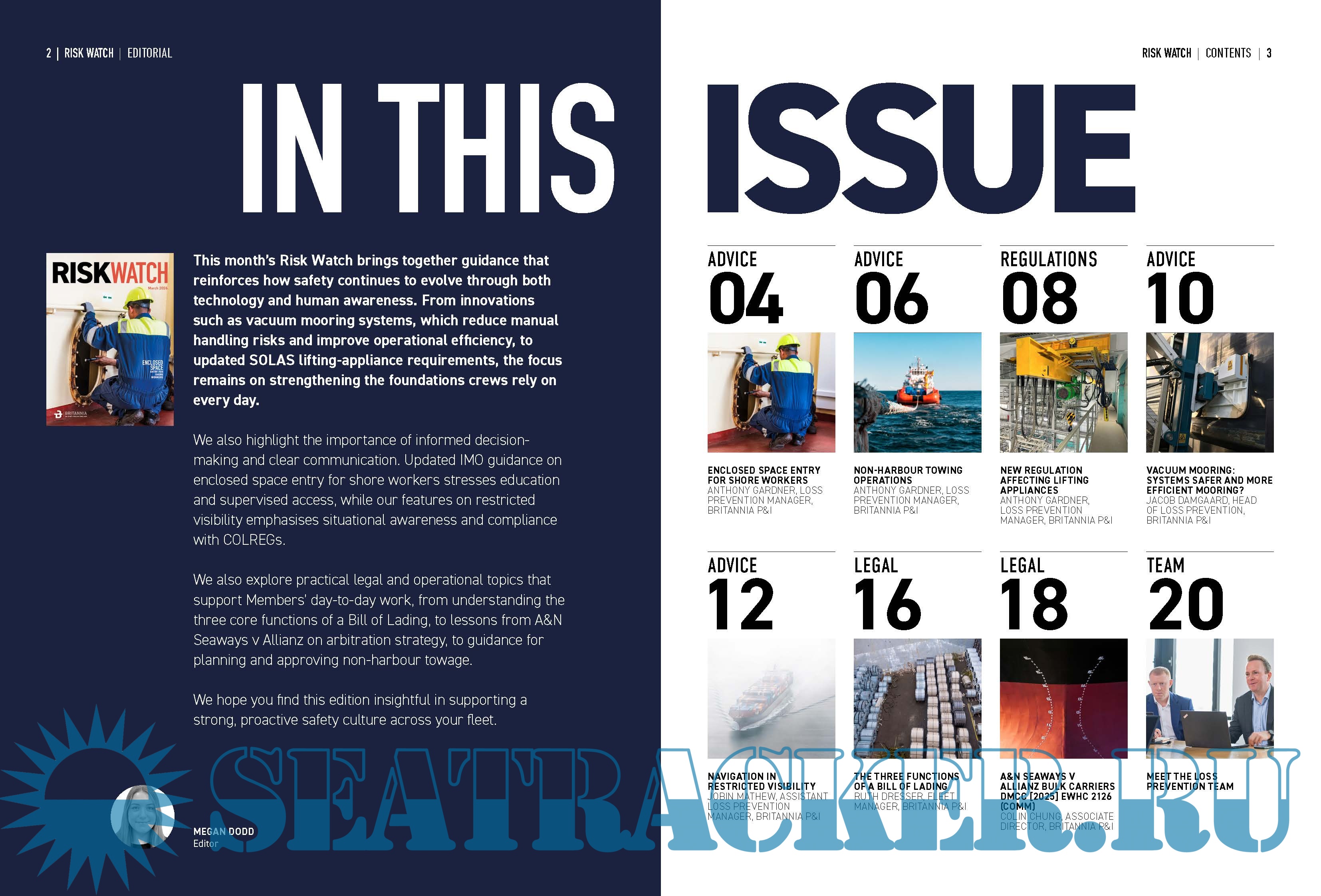Year: 2026 Language: English Author: Britannia P&I Club Genre: Bulletin Publisher: Britannia P&I Club Edition: March 2026 Format: PDF Quality: eBook Pages count: 24 Description: This month’s Risk Watch brings together guidance that reinforces how safety continues to evolve through both technology and human awareness. From innovations such as vacuum mooring systems, which reduce manual handling risks and improve operational efficiency, to updated SOLAS lifting-appliance requirements, the focus remains on strengthening the foundations crews rely on every day. Also highlight the importance of informed decision making and clear communication. Updated IMO guidance on enclosed space entry for shore workers stresses education and supervised access, while our features on restricted visibility emphasises situational awareness and compliance with COLREGs. Also explore practical legal and operational topics that support Members’ day-to-day work, from understanding the three core functions of a Bill of Lading, to lessons from A&N Seaways v Allianz on arbitration strategy, to guidance for planning and approving non-harbour towage.