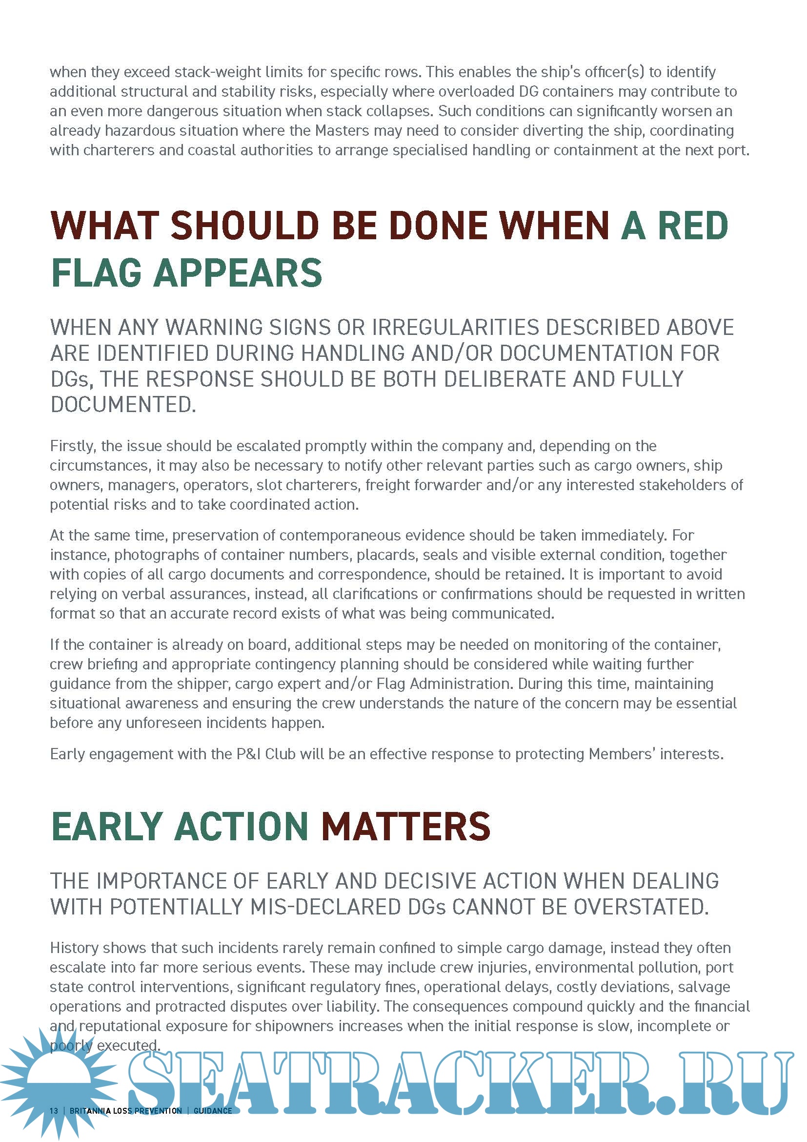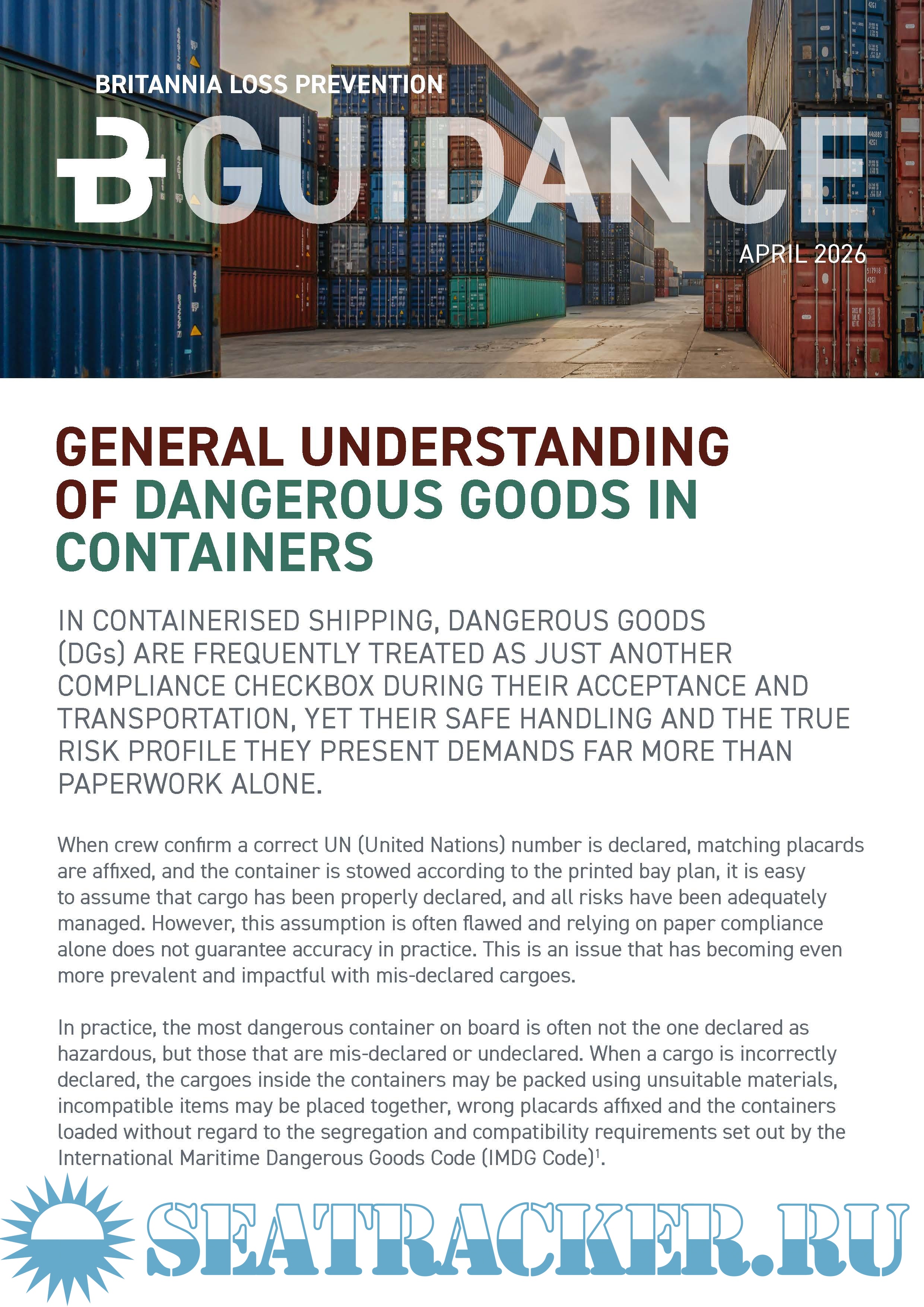 Year: 2026 Language: English Author: Britannia P&I Club Genre: Guidance Notes Publisher: Britannia P&I Club Edition: April, 2026 Format: PDF Quality: eBook Pages count: 14 Description: Loss Prevention Guidance | General understanding of Dangerous Goods in Containers When crew confirm a correct UN (United Nations) number is declared, matching placards are affixed, and the container is stowed according to the printed bay plan, it is easy to assume that cargo has been properly declared, and all risks have been adequately managed. However, this assumption is often flawed and relying on paper compliance alone does not guarantee accuracy in practice. This is an issue that has becoming even more prevalent and impactful with mis-declared cargoes. In practice, the most dangerous container on board is often not the one declared as hazardous, but those that are mis-declared or undeclared. When a cargo is incorrectly declared, the cargoes inside the containers may be packed using unsuitable materials, incompatible items may be placed together, wrong placards affixed and the containers loaded without regard to the segregation and compatibility requirements set out by the International Maritime Dangerous Goods Code (IMDG Code).