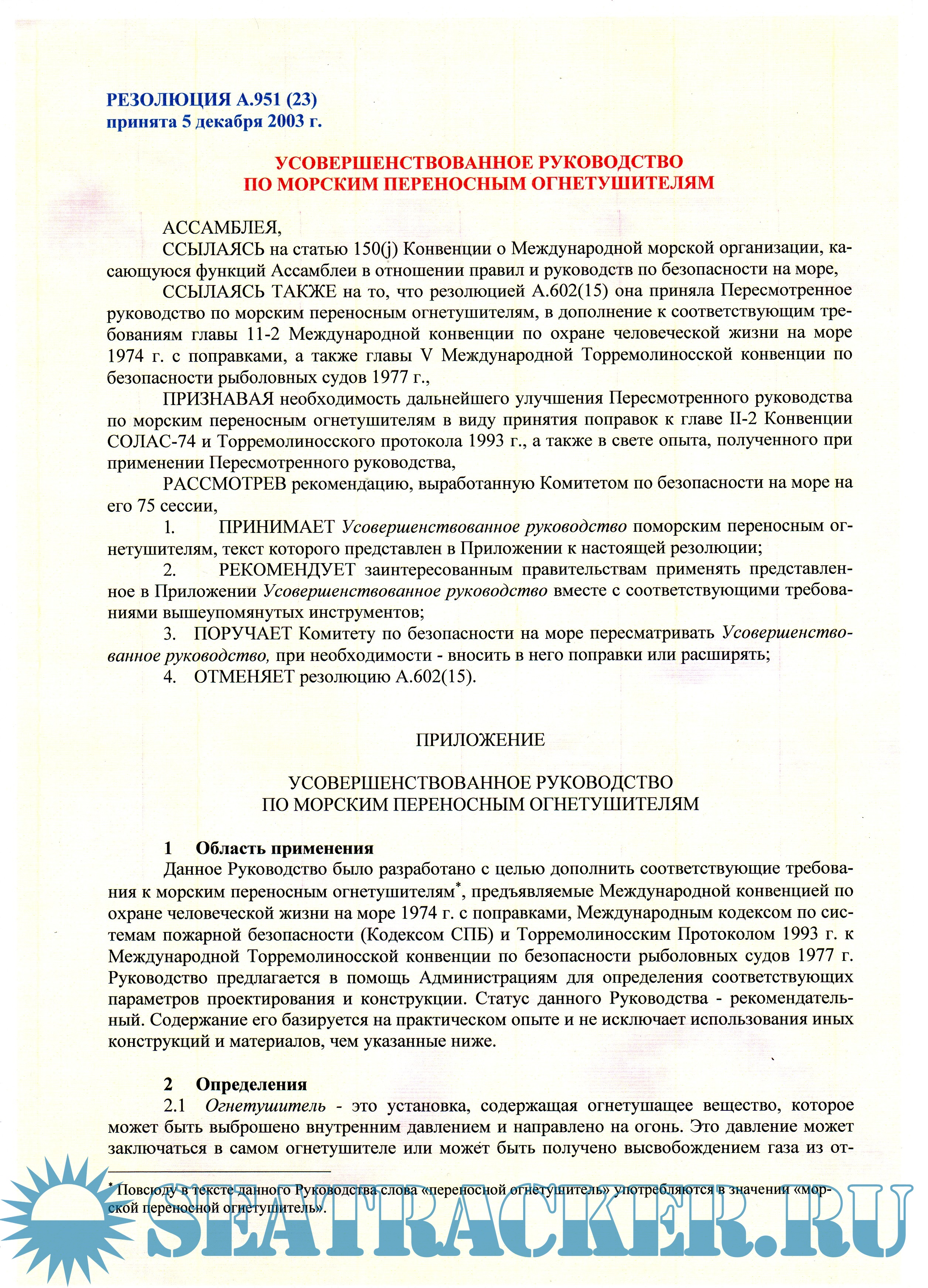 Описание: Данное Руководство было разработано с целью дополнить соответствующие требования к морским переносным огнетушителям", предъявляемые Международной конвенцией по охране человеческой жизни на море 1974 г. с поправками, Международным кодексом по системам пожарной безопасности (Кодексом СПБ) и Торремолиносским Протоколом 1993 г. к Международной Торремолиносской конвенции по безопасности рыболовных судов 1977 г. Руководство предлагается в помощь Администрациям для определения соответствующих параметров проектирования и конструкции. Статус данного Руководства - рекомендательный. Содержание его базируется на практическом опыте и не исключает использования иных конструкций и материалов, чем указанные ниже.