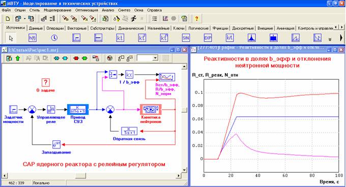 -Подробное описание программного комплекса: Программный комплекс «МВТУ» [1–5] предназначен для исследования динамики и проектирования самых разнообразных систем и устройств. По своим возможностям он является альтернативой аналогичным зарубежным программным продуктам Simulink, VisSim и др. Удобный редактор структурных схем, обширная библиотека типовых блоков и встроенный язык программирования позволяют реализовывать модели практически любой степени сложности, обеспечивая при этом наглядность их представления. ПК «МВТУ» успешно применяется для проектирования систем автоматического управления, следящих приводов и роботов-манипуляторов, ядерных и тепловых энергетических установок, а также для решения нестационарных краевых задач (теплопроводность, гидродинамика и др.). Широко используется в учебном процессе, позволяя моделировать различные явления в физике, электротехнике, в динамике машин и механизмов, в астрономии и т.д. Может функционировать в многокомпьютерных моделирующих комплексах, в том числе и в режиме удаленного доступа к технологическим и информационным ресурсам.-ПК «МВТУ» реализует следующие режимы работы: