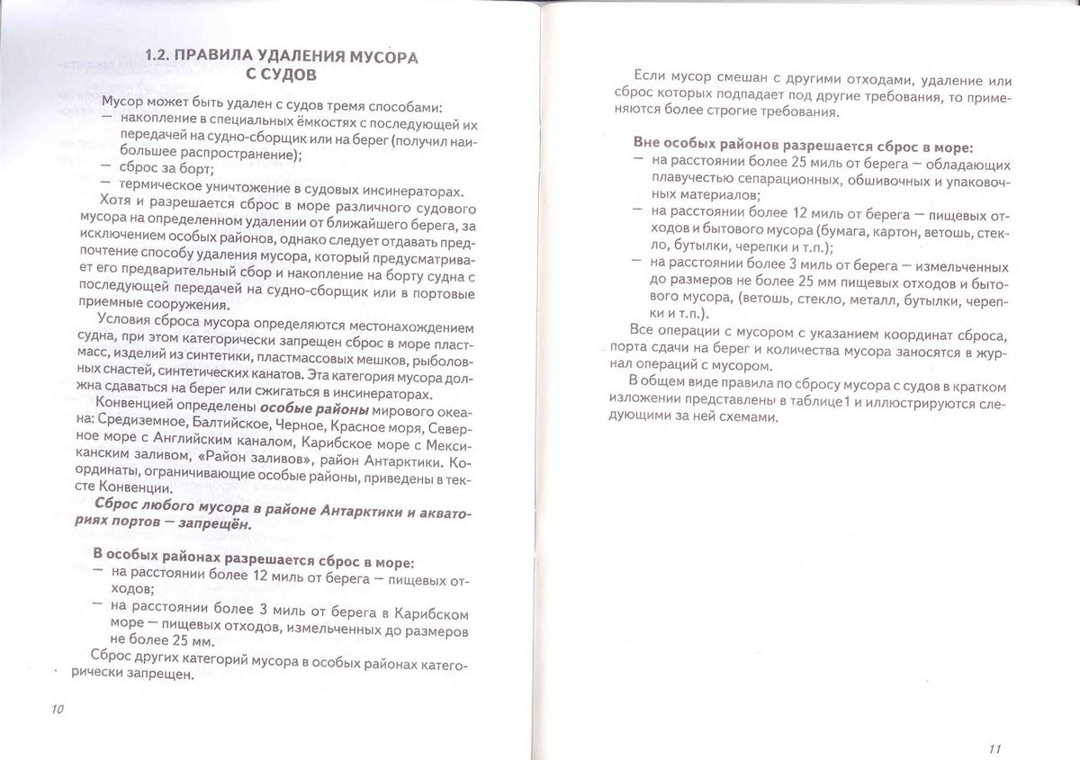 ВВЕДЕНИЕ Неконтролируемые и нерегулируемые выбросы в моря и водоёмы различных отходов и нефтепродуктов, катастрофические разливы нефти и вредных веществ, загрязнения атмосферы озоноразрушающими и другими токсичными веществами, создали условия необратимости процессов в экосистеме планеты, представляющие угрозу биосфере, здоровью и жизни людей. С целью устранения негативных последствий, вызванных загрязнениями окружающей среды, были приняты и ратифицированы Международные соглашения, а во многих странах разработаны также и Национальные программы по предотвращению загрязнения окружающей среды и, в первую очередь, морей, водоемов и атмосферы. Международной морской организацией, являющейся органом ООН, в 1973 году была принята Международная конвенция МАРПОЛ 73 по предотвращению загрязнения с судов. Конвенция МАРПОЛ 73 и изменения к ней Протоколами, принятыми в 1978 и 1997 годах, представляют собой единый документ, называемый “Конвенция МАРПОЛ 73/78”, далее по тексту именуемый “Конвенция”. Конвенцией установлены положения правового, организационного и технического характера, которые предусматривают меры по сокращению и предотвращению загрязнения веществами, вредными для воздушной среды, флоры и фауны морей и водоёмов, которые перевозятся или образуются в процессе эксплуатации судов. Правила Конвенции распространяются на различные источники загрязнений с судов, которые изложены в шести Приложениях к Конвенции, а Приложение V посвящено предотвращению загрязнения мусором. Приложением V регулируются процессы сбора, хранения, обработки и уничтожения му- сора на борту и удаления его с судов, а также установлены требования к соответствующим техническим средствам. Наряду с другими загрязнителями, мусор, сбрасываемый с судов, является устойчивым и, в большинстве случаев, наиболее опасным загрязнителем, нарушающим естественный процесс самоочищения водной среды. Мусор образуется на судах в процессе их эксплуатации и связан с перевозкой грузов, техническим обслуживанием и ремонтом судовых технических средств и корпусных конструкций, жизнедеятельностью членов экипажа и пассажиров. В настоящем учебном пособии освещены нормативные требования к управлению операциями по обращению с мусором и средствам обработки мусора на борту судна, а также правила сброса различных категорий мусора в море. Рассмотрены основные типы современных установок по уничтожению мусора и приведены рекомендации по их эксплуатации и обслуживанию.