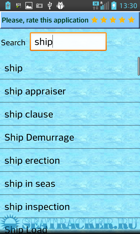 Description: This is a small application working on all android-based devices. As the name implies, the Offline Dictionary of Marine Terms and Abbreviations app was developed to cover most of the necessary terms and abbreviations that are in regular use in the marine industry - among the topics included there are shipping, maritime industry, chartering, marine engineering, ship construction, sailing and nautical terms, imfo and communication technologies and others. The intention of the developers was to assist the ship crew members, shipping companies staff and future mariners with their day to day work or study. The application contains more than ninety thousand marine terms and abbreviations. You do not have to be connected to the internet, the app does not need your device to be online.