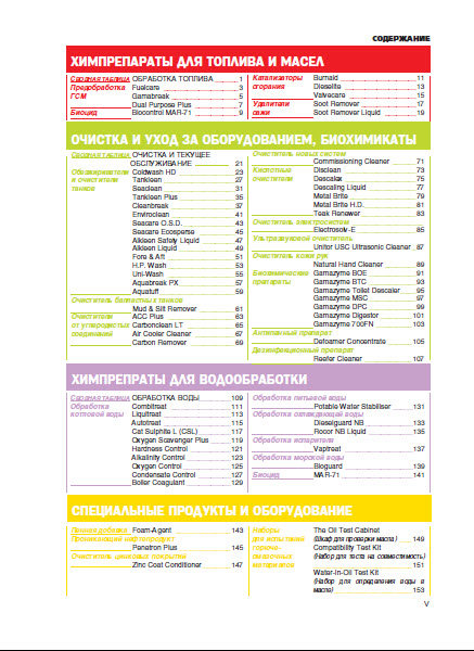 КРАТКОЕ СОДЕРЖАНИЕ I ОБЩАЯ ИНФОРМАЦИЯ II СОДЕРЖАНИЕ V АЛФАВИТНЫЙ УКАЗАТЕЛЬ VII ХИМПРЕПАРАТЫ ДЛЯ ТОПЛИВА И МАСЕЛ 1 ОЧИСТКА И УХОД ЗА ОБОРУДОВАНИЕМ, БИОХИМИКАТЫ 21 ХИМПРЕПАРАТЫ ДЛЯ ВОДООБРАБОТКИ 109 СПЕЦИАЛЬНЫЕ ПРОДУКТЫ И ОБОРУДОВАНИЕ 149 ОБЩАЯ ИНФОРМАЦИЯ